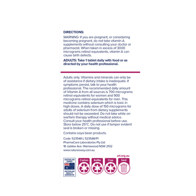 WARNING: If you are pregnant - or considering becoming pregnant - do not take Vitamin A supplements without consulting your doctor or pharmacist. When taken in excess of 3000 micrograms retinol equivalents - Vitamin A can cause birth defects. Adults only. Vitamins and minerals can only be of assistance if dietary intake is inadequate. If symptoms persist, talk to your health professional. The recommended daily amount of Vitamin A from all sources is 700 micrograms retinol equivalents for women and 900 micrograms retinol equivalents for men. This medicine contains selenium which is toxic in high doses. A daily dose of 150 micrograms for adults of selenium from dietary supplements should not be exceeded. Do not take while on warfarin therapy without medical advice. Consult your health professional before use.